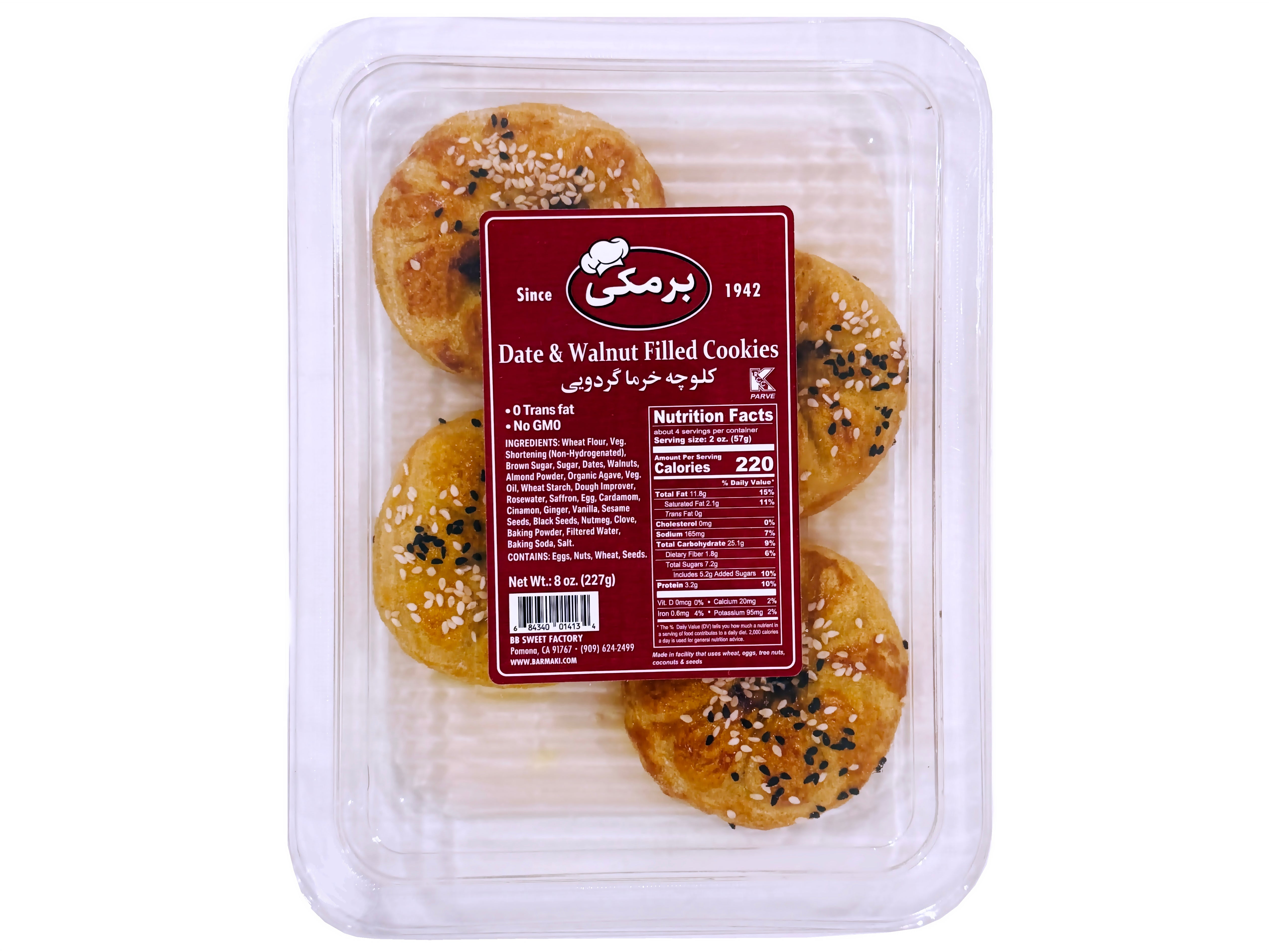 INGREDIENTS: Wheat Flour, Veg. Shortening (Non-Hydrogenated), Brown Sugar, Sugar, Dates, Walnuts, Almond Powder, Organic Agave, Veg. Oil, Wheat Starch, Dough Improver, Rosewater, Saffron, Egg, Cardamom, Cinnamon, Ginger, Vanilla, Sesame Seeds, Black Seeds, Nutmeg, Clove, Baking Powder, Filtered Water, Baking Soda, Salt.