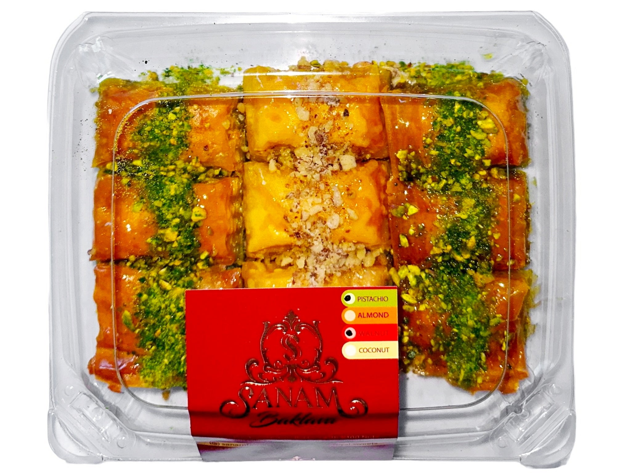 Ingredients: Pistachio, Walnuts, Cane Sugar, Cardamom, Egg, Pasteurized cream(Milk) natural flavorings, Wheat Flour, Water, Corn starch, Salt, Dextrose, Potassium sorbate, Rose petals